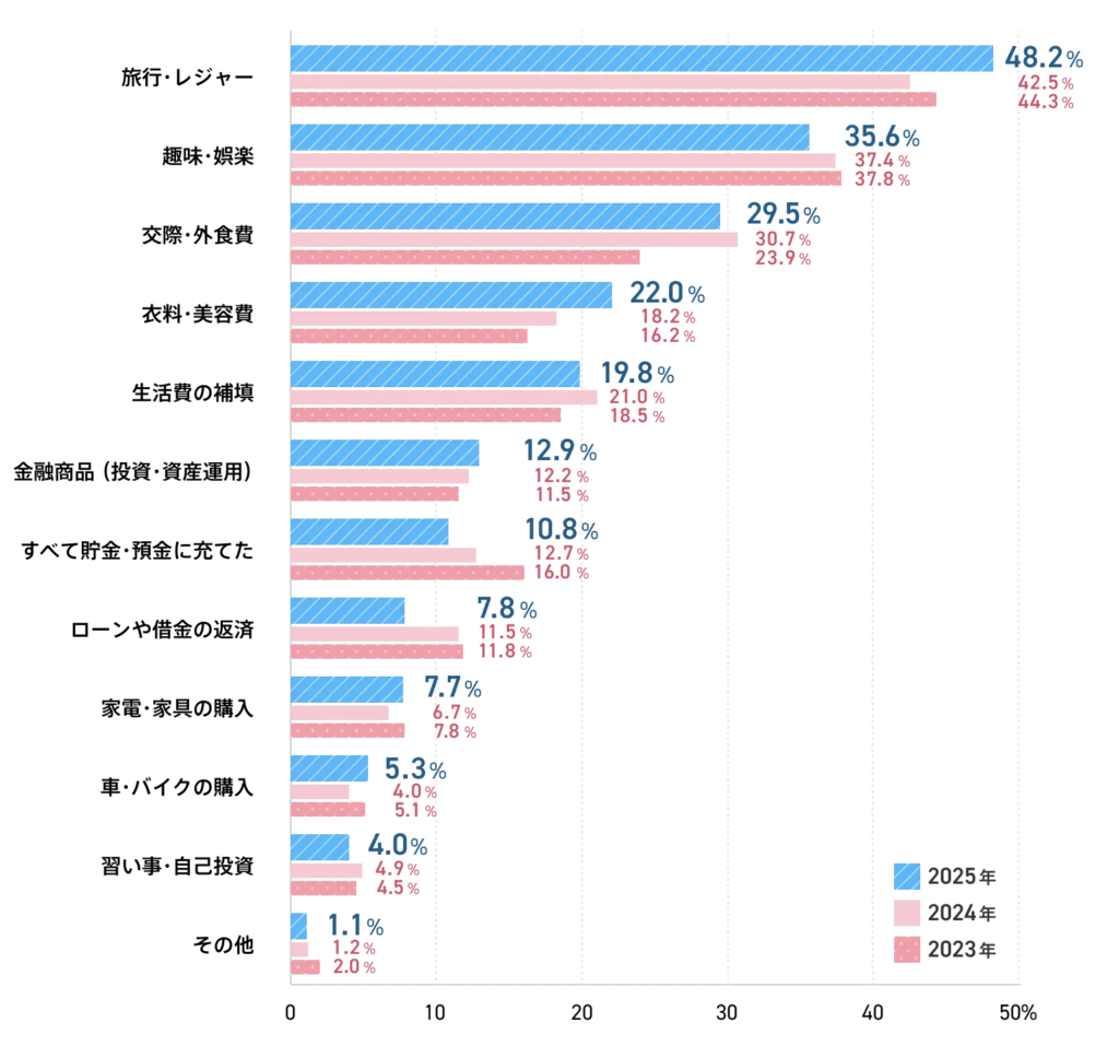 また、前回から割合が増えた項目には、「旅行・レジャー」のほかに「衣料・美容費」(2024年:18.2%、2025年:22.0%)や「金融商品(投資・資産運用)」(2024年:12.2%、2025年:12.9%)などがありました。