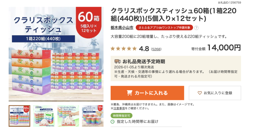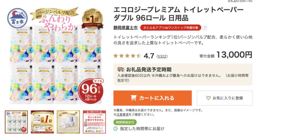 各ふるさと納税サイトをみていると食品以外ではティッシュやトイレットペーパーの日用品が人気でした。実際のところ私は日用品を注文したことはありません。理由としては自宅の保管スペースがないからです。現在1K7畳ほどの賃貸に住んでおり、収納スペースがかなり限られています。ティッシュやトイレットペーパーは日常生活において不可欠なものではありませんが、ティッシュ60箱やトイレットペーパー8パックが一度に届いても保管する場所がなく居住スペースがなくなってしまいます。自宅に十分な収納スペースがあれば私も毎年注文したいと思っています。